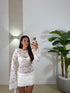 abito corto con ricamato trasparente sulla parte superiore, sotto gonna drappeggiata corta con fusciacca laterale