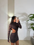 abito corto ricamato con schiena e fianchi scoperti e laccetti incrociati sul retro
