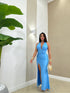 abito lungo elegante allacciato al collo con schiena scoperta e spacco laterale