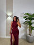 abito lungo giromanica con fascia drappeggiata sull'addome e doppio spacco alto anteriore