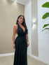 abito lungo elegante con schiena scoperta, incrocio sotto il seno e rouches davanti