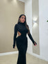 abito lungo velato sul fondo con collo alto, drappeggiato su fianchi ed addome con schiena scoperta