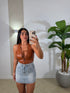mini gonna in denim azzurro con applicazione brillantini margi indossa S