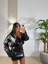 coordinato in eco-pelle composto da gonna corta e giubbinetto con collo e zip