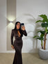 abito lungo a sirena manica lunga con spallina strutturata scollo centrale e schiena scoperta