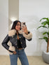 giubbino corto ecopelle con dettagli oro e collo in pelliccia