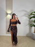 coordinato 2 pezzi gonna lunga con spacco laterale e maglia crop con manica velata e dettagli in paillettes
