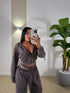tuta completa 2 pezzi composta da pantalone con apertura laterale sull'elastico e felpa crop con zip e cappuccio
