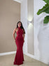 abito lungo elegante a sirena con schiena e spalle scoperte e drappeggio sull'addome